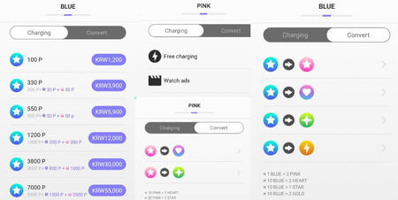 | Se consiguen por pagos, 1 blue = 2 pink | Se consiguen de forma gratuita | Se usan para las votaciones con ceremonias de premiación. |